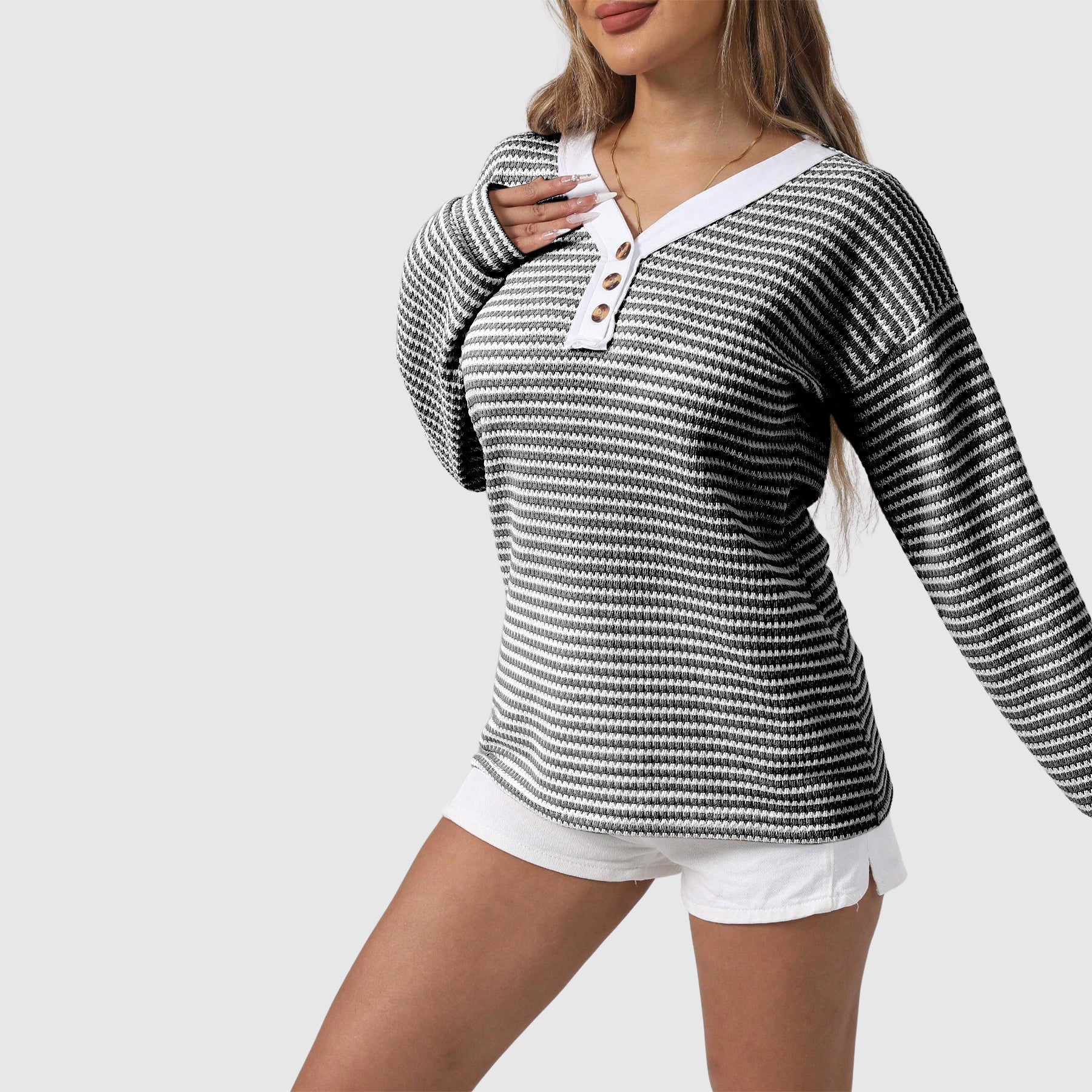 The Elise Leroy Modern Stitch Sweater brings playful charm to your autumn wardrobe with its chic V-neck, button accents, and artful color-block stitching that feels fresh yet timeless. Designed for cozy days that still call for a touch of style, this piece blends casual comfort with a modern twist—perfect for coffee runs, weekend strolls, or just looking effortlessly put-together.